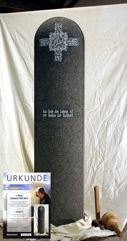 Der hier abgebildete QR-Grabstein, wurde von uns 2012 für den Grabmal-TED entworfen und realisiert.